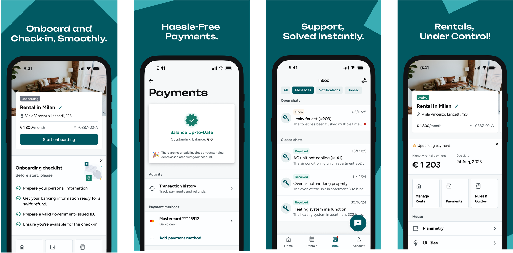 All these actions can be done comfortably by accessing the different sections of the App: Rental, Support and Account. It is also possible to check the appointments set for the apartment, brand-new entries, client visits, and maintenance activities.