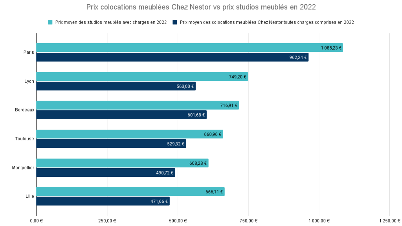 Prix moyen des studios meublés avec charges en 2022 | Prix moyen des colocations meublées Chez Nestor toutes charges comprises en 2022 | Écart en valeur | Écart en pourcentage | |
