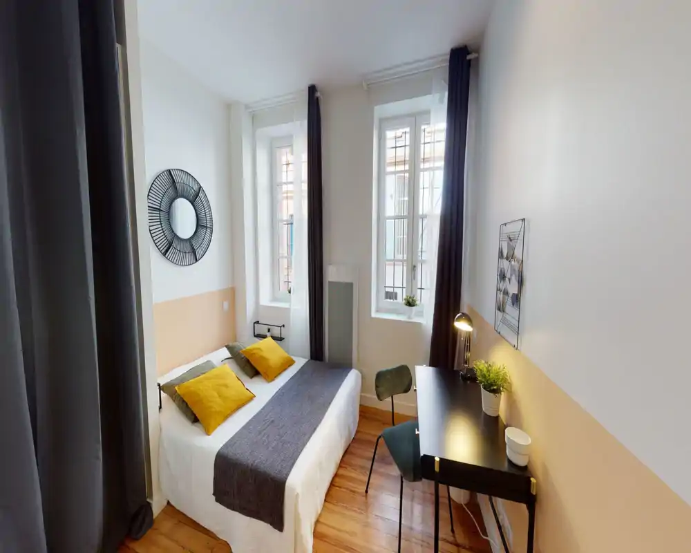 Dans le quartier Jeanne d'Arc, cette chambre lumineuse propose un cadre de vie pratique à Toulouse. L'espace convient à un lit double et se situe au rez‑de‑chaussée pour un accès facile.