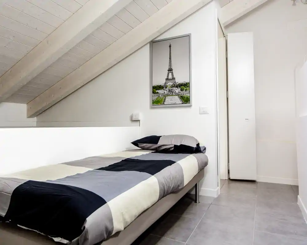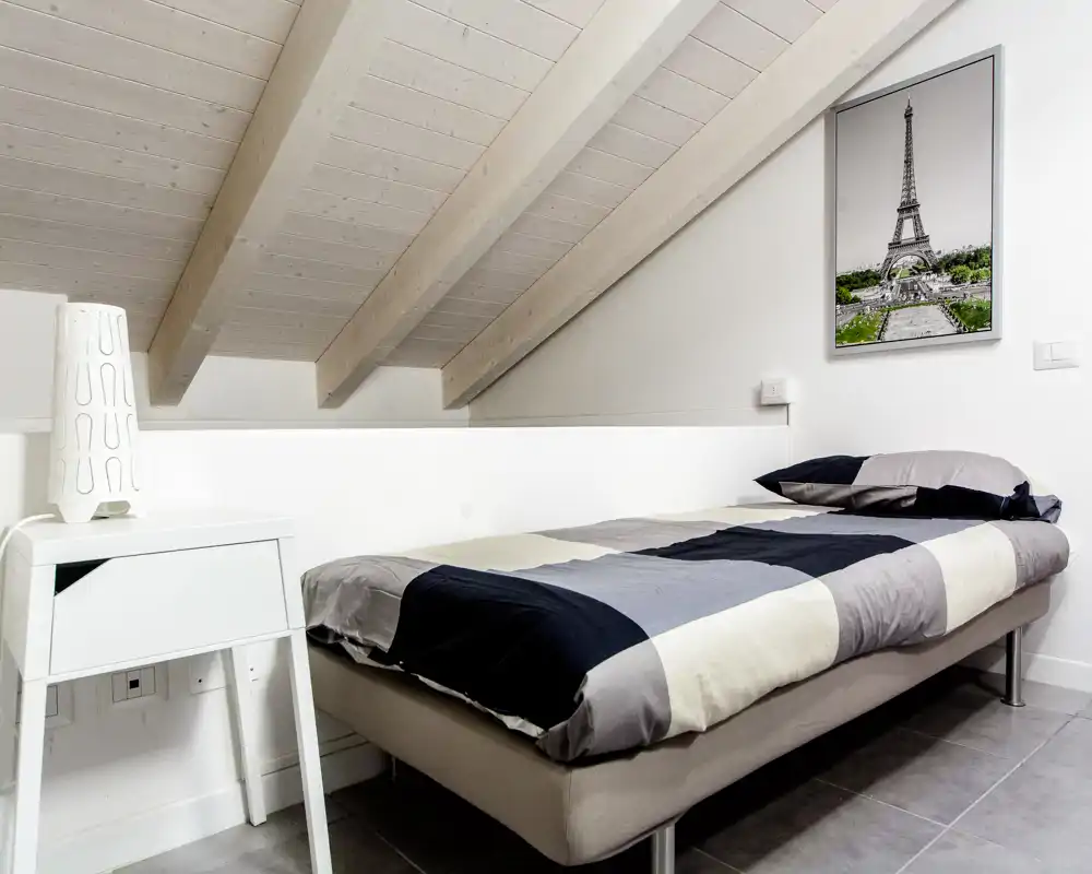 La stanza misura 15 m² e dispone di letto singolo; l'appartamento è dotato di Wi‑Fi, riscaldamento e forno. L'abitazione comprende un bagno, lavastoviglie e lavatrice per la massima praticità.