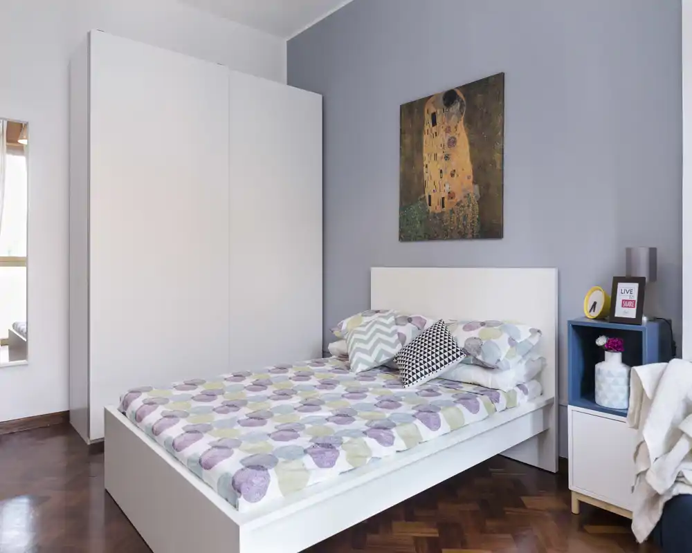 Stanza luminosa di 20 m² in un appartamento con 6 stanze e 2 bagni. Dotazioni: letto queen size, Wi‑Fi, forno, lavatrice e lavastoviglie per una vita quotidiana comoda.
